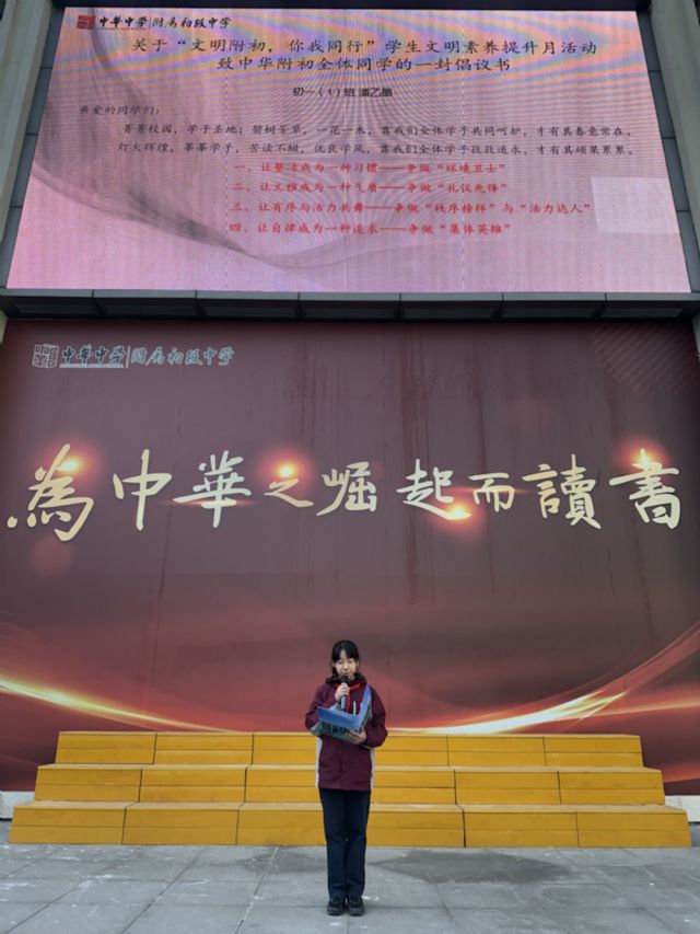 第13周晨会 国旗下演讲:关于“文明附初,你我同行”学生文明素养提升月活动 致中华附初全体同学的一封倡议书(初一1班 潘乙墨)